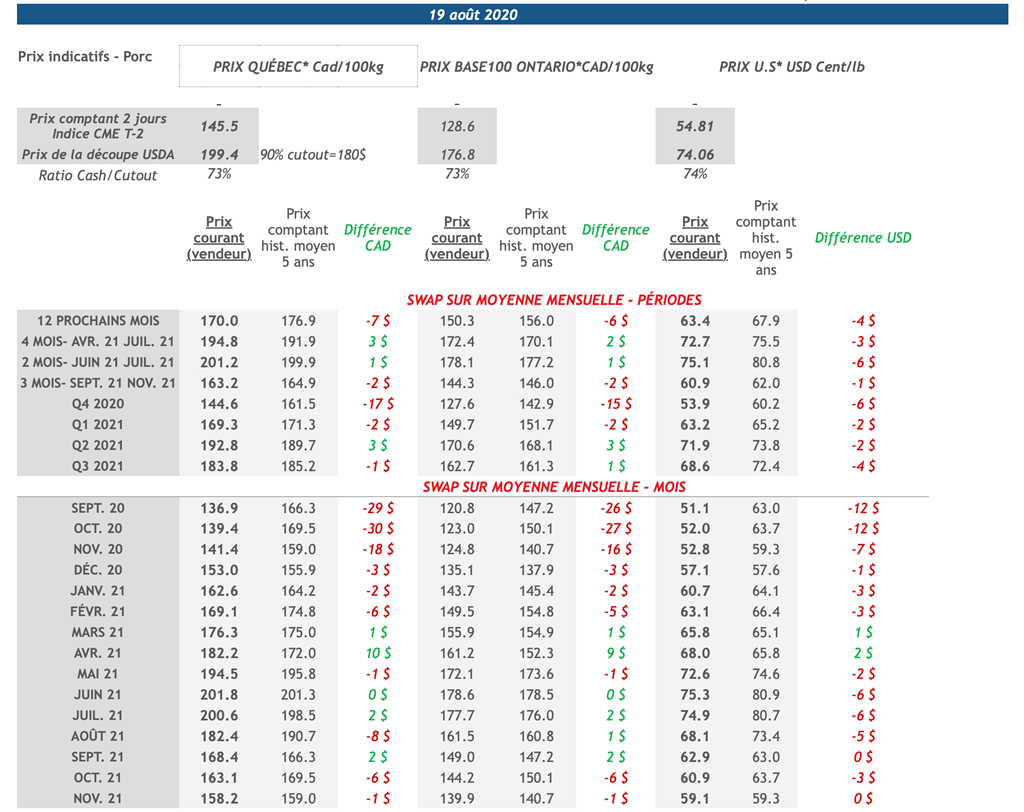 • Après avoir terminé la journée de lundi avec de légers gains pour la plupart des échéances, les contrats de porcs ont majoritairement perdu leur avance hier. Les contrats d'octobre et de décembre 2020 étaient en baisse de 2,100 (-3.92%) et -1,775 (-3,23%) cents USD/lb par rapport à lundi.
