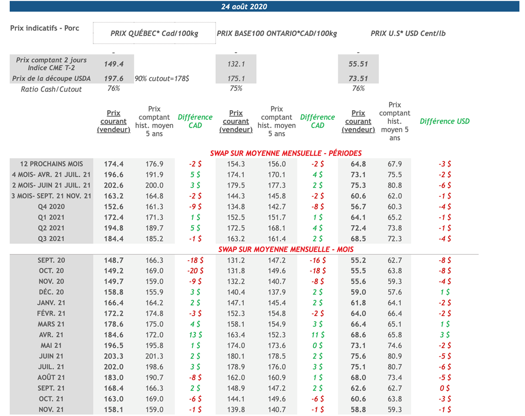 • La progression de l'indice de découpe de porc U.S. s'est terminée vendredi alors qu'il s'est établi à 73,51 cents USD/lb (-2,57 cents USD/lb (-2,5%) par rapport à jeudi). Le chute du prix jambon, passant de 75,71 à 59,27 cents USD/lb (-21,7%) de jeudi à vendredi, a entraîné la découpe à la baisse. La découpe est en baisse de 1,42 cent USD/lb (-1,9%) par rapport à vendredi le 14 août.