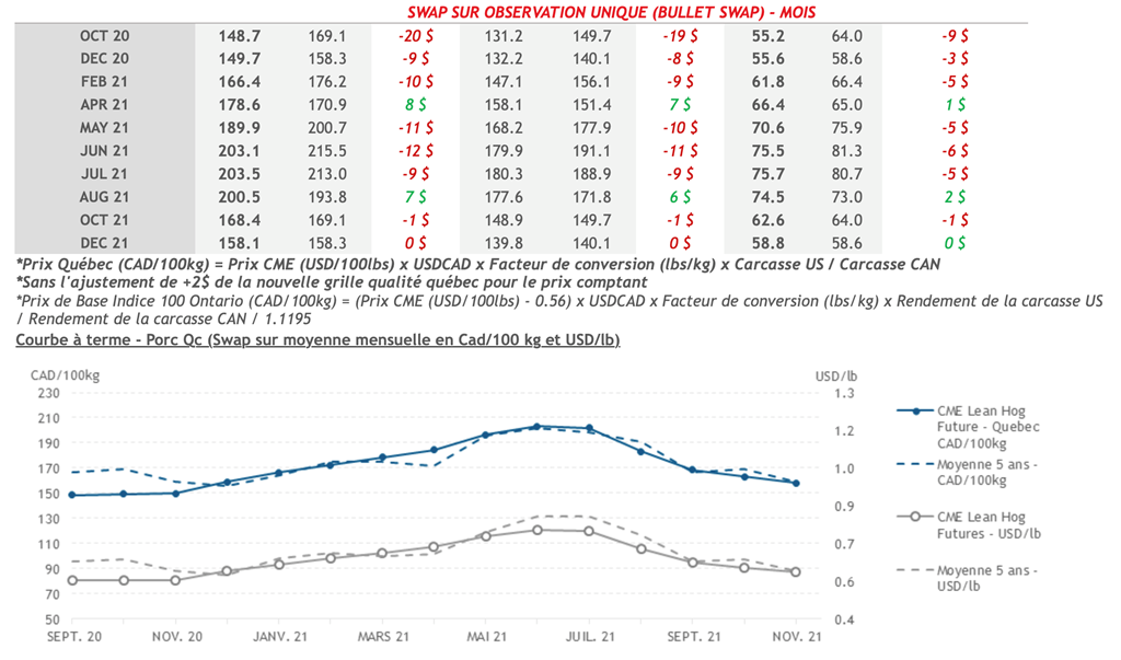 • Les contrats de porcs ont terminé la journée en baisse pour toutes les échéances vendredi après avoir été pour la majorité en hausse pour deux jours consécutifs. Les pertes ont été moins de 1 cent USD/lb pour tous les contrats.