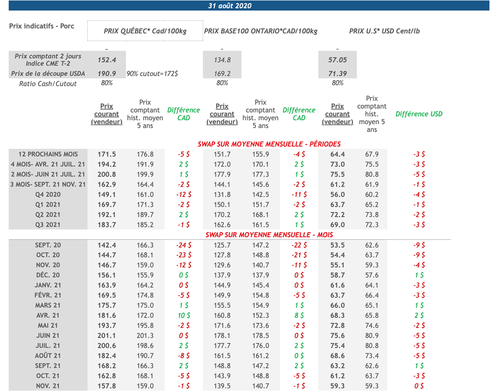 • Les contrats de porcs ont terminé la journée en baisse pour toutes les échéances vendredi. Les contrats d'octobre et de décembre 2020 ont clôturé à 53,65 et 55,20 cents USD/lb avec des pertes de 2,075 (-3.72%) et 1,375 (-2.43%) cents USD/lb respectivement. Les pertes ont été de moins de 1 cent USD/lb pour le reste des échéances.