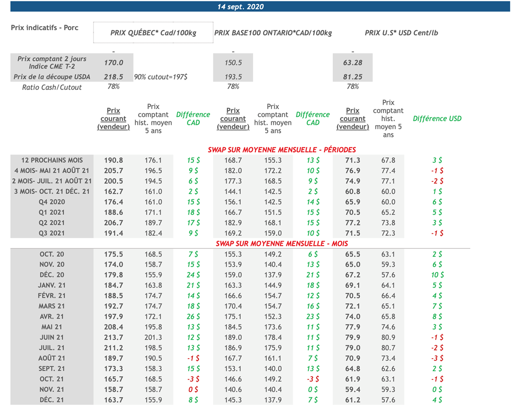 • L'indice de découpe de porc U.S. était également en hausse vendredi en terminant la journée à 81,25 cents USD/lb et est en hausse de 0,69 cent USD/lb (+1%) par rapport à vendredi le 4 septembre.