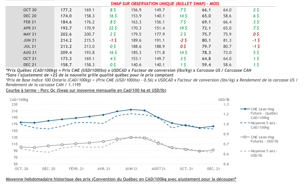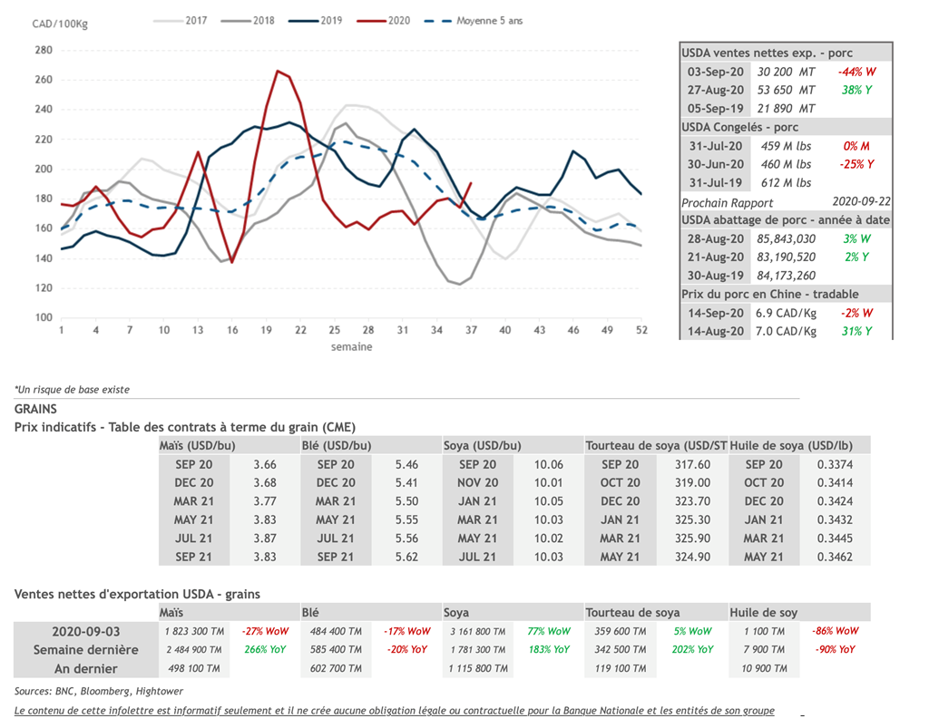 • Nous avons eu droit à une autre journée haussière pour les contrats de porc ce vendredi alors que presque toutes les maturité étaient en hausse. Les contrats d'octobre 2020 et de février 2021 se sont les plus appréciés en terminant respectivement à 66,575 et 69,475 cents USD/lb, soit un gain de 2,20 (+3,45%) et 3,15 (+5,01%) cents USD/lb.