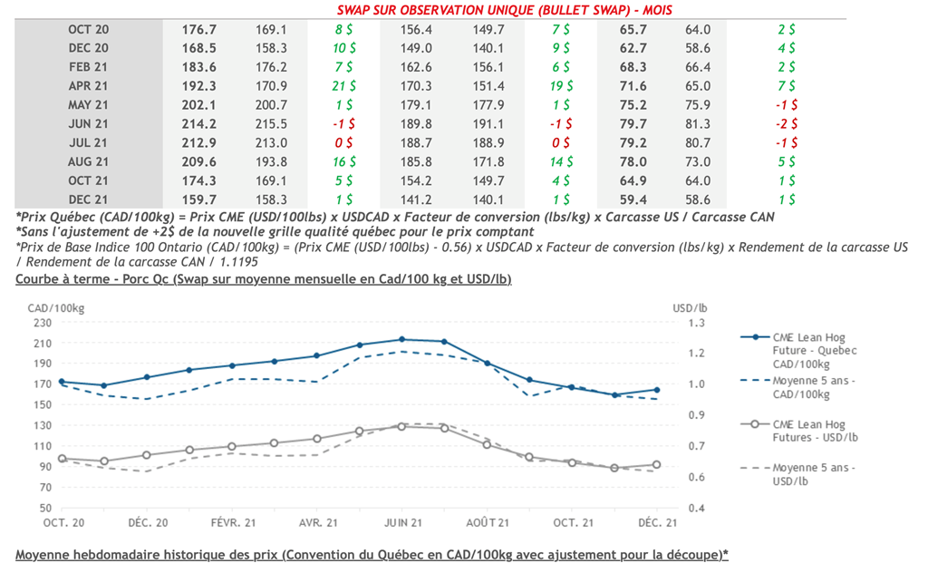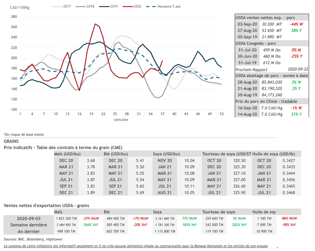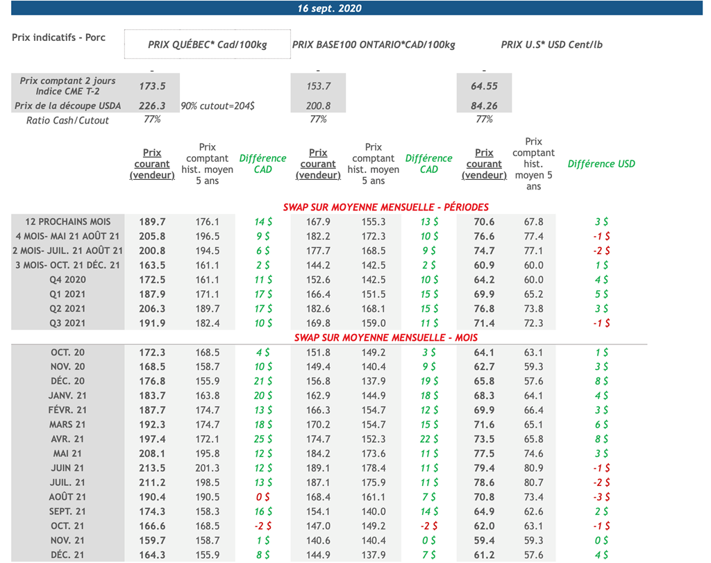• Les prix des contrats de porcs ont terminé en baisse mardi sauf pour ceux échéant en octobre 2020 (+1.075 cents USD/lb) et 2021 (inchangé).