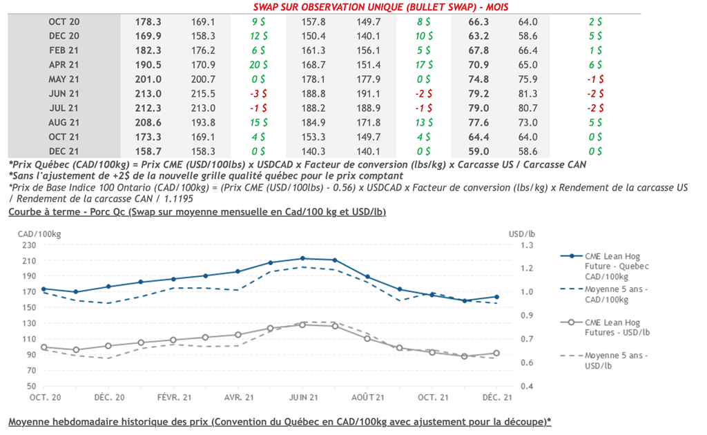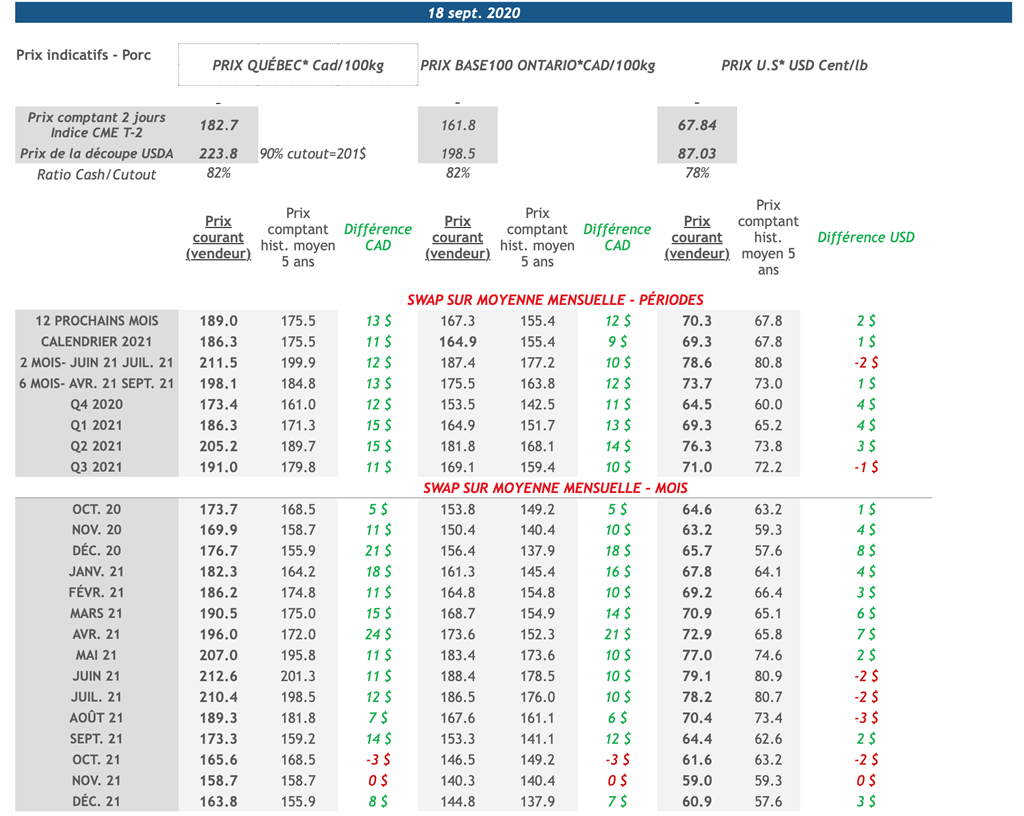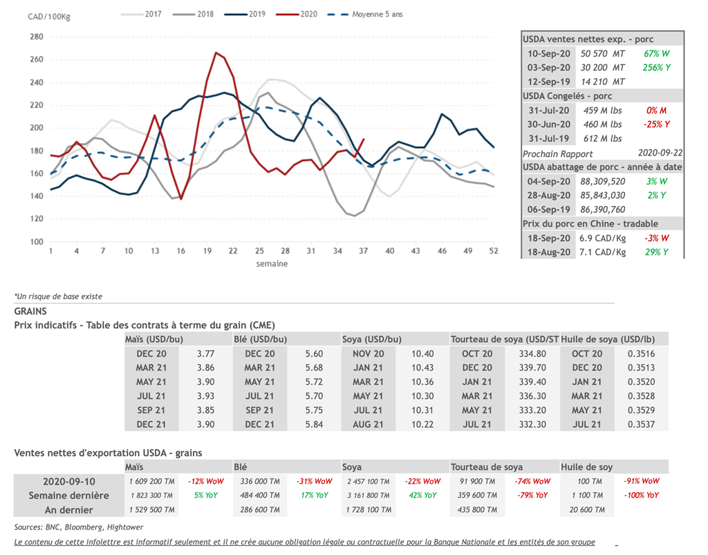 •Les prix des contrats de porc ont terminé en hausse jeudi pour les échéances d'octobre 2020 (+1.300 cent USD/lb), décembre 2020 (+1.650 cent USD/lb), février 2021 (+0.450 cent USD/lb) et mai 2021 (+0.275 cent USD/lb). Les prix des autres échéances étaient en légère baisse.