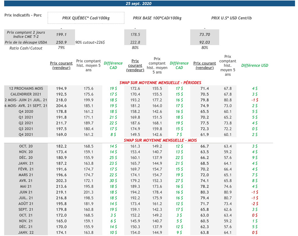 • Après avoir chuté mardi, l’indice de la découpe de porc U.S. a fait des gains depuis. Hier, la découpe s’est établie à 92,03 cents USD/lb, soit un gain de 4,50 USD cents (+5,1%) depuis vendredi le 18 septembre. Le prix de la découpe est à son plus haut niveau depuis la mi-mai et est beaucoup plus élevé qu’à la fin septembre l’an dernier ou le prix se trouvait dans l’intervalle de 70 à 75 cents USD/lb.