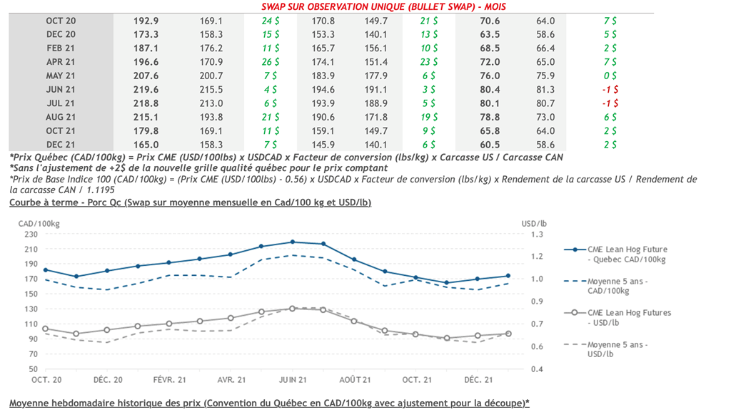 • Les prix des contrats de porc étaient en baisse pour toutes les échéances hier. Le contrat de décembre 2020 s’est établi à 65,275 cents USD/lb avec la plus grande perte, soit 1.075 USD cent/lb (-1,67%).
