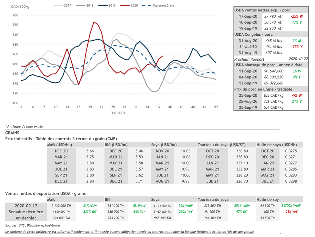 • Le rapport trimestriel Hogs and Pigs de l’USDA a laissé les analystes perplexes hier. Le nombre total de porcs aux États-Unis était de 79,1M en date du 1er septembre (+0.7% contre l'an passé). Bien que le nombre de porcs soit en baisse de 0,7% par rapport aux chiffres du 1er juin, il s’agit d'un nombre record de porcs enregistré pour cette période-ci de l’année. Ce qui semble préoccuper davantage les analystes c’est surtout le nombre de porcs dans les strates de poids plus élevées. En effet, on observe une hausse de 6.1% dans la strate de poids 120-179 lbs et 9.8% poids 180 lbs et plus. Ces chiffres sont une indication que le nombre de porcs prêts à être abattus pourrait être plus élevé à court terme que ce que le marché entrevoyait.