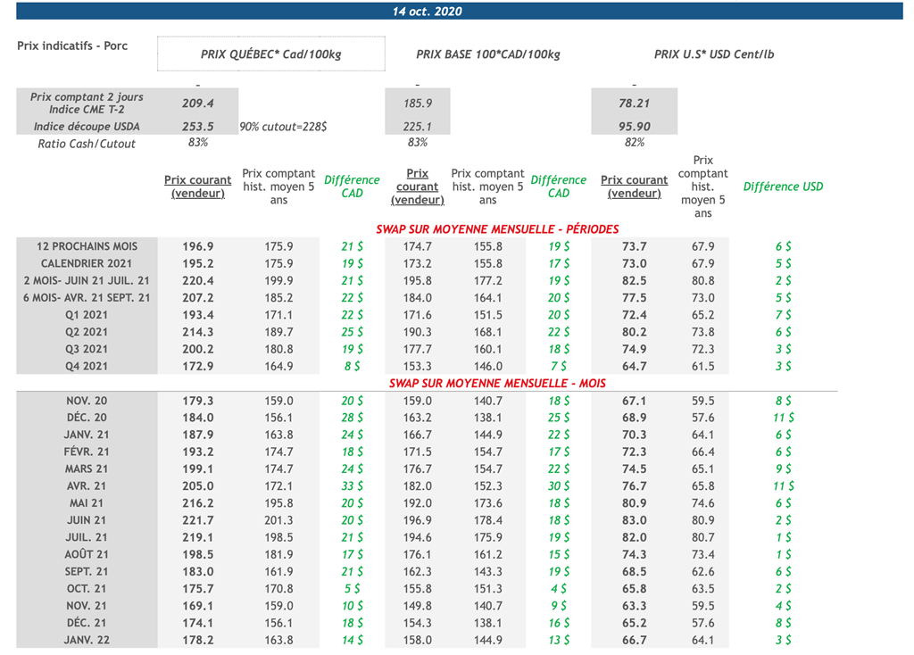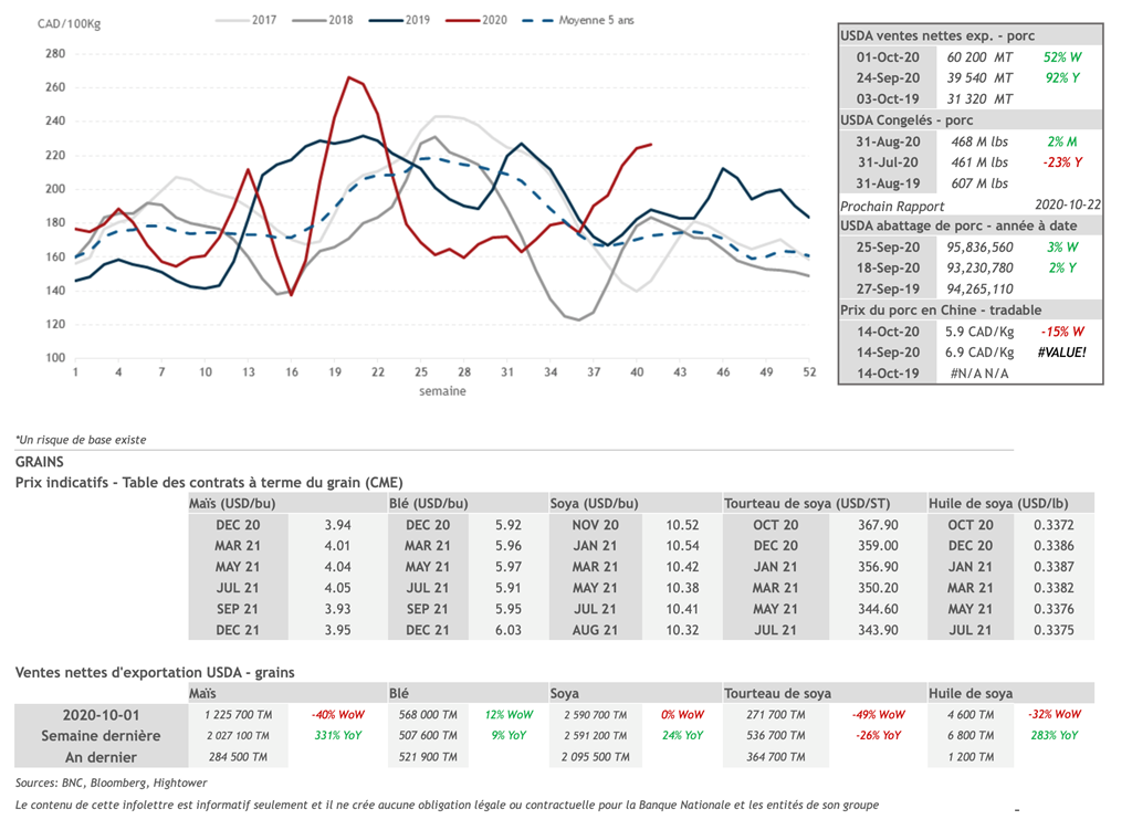 • Journée mixte hier pour les contrats de porcs, on note une hausse modérée des prix sur les mois d'avr. à oct-21. Le contrat d'oct.-20 est prévu pour expirer aujourd'hui et s'est arrêté à 77,80 cents U.S./lb à la fermeture d'hier alors que l'indice CME lean hog se positionne à 78,21 cents U.S./lb.