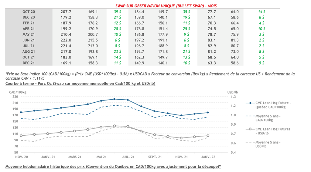 • L'indice de la découpe U.S. atteint un nouveau sommet à 95,90 cents U.S./lb (+1,59 cents U.S./lb), après une semaine peu mouvementée en raison du marché étant perçu comme suracheté et les rumeurs comme quoi la Chine risquerait d'importer moins de porcs en 2021.
