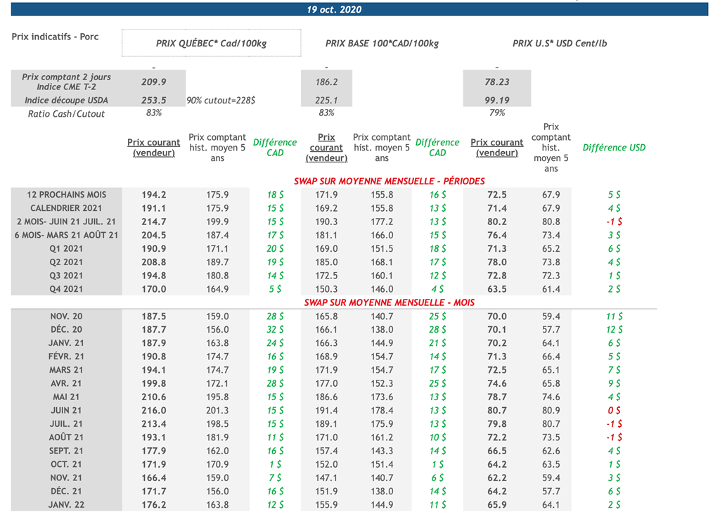 • L’indice de découpe de porc U.S. est redescendu sous le seuil de 100 cents USD/lb vendredi. L’indice a s’est établi à 99,19 cents USD/lb avec une baisse de 2,23 cents USD/lb (-2,2%) et a progressé de 4,4% par rapport à vendredi le 9 octobre. Les prix de toutes les coupes étaient en baisse sauf celui de la longe. Le jambon a une fois de plus fait reculer la découpe en terminant la journée à 84,87 cents USD/lb avec une perte de 8,67 cents USD/lb (-9,3%)