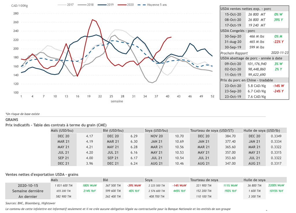 • Les prix du maïs continuent de grimper ce matin à Chicago, cette fois soutenus par la forte demande chinoise. Ce qui retient l'attention des marchés ce matin, ce sont les importations de la Chine pour 2020 sont déjà à leur plus haut niveau en 15 ans alors que l'année n'est pas encore terminée. Les importations ont été de 1,1M de tonnes en septembre, soit une hausse de 675% année sur année. Les importations ont été de 6,7M de tonnes pour la période de janvier à septembre, soit une hausse 73% année sur année. La demande chinoise en maïs demeure forte alors que les ralentissements des récoltes du maïs dans le nord-est de la Chine ont entraîné le prix des contrats à terme sur le maïs à leur plus haut niveau en 16 ans à la bourse de Dalian en Chine.