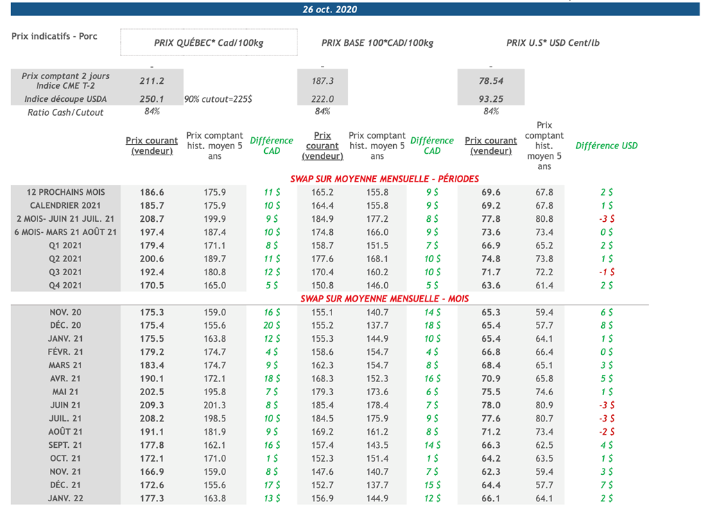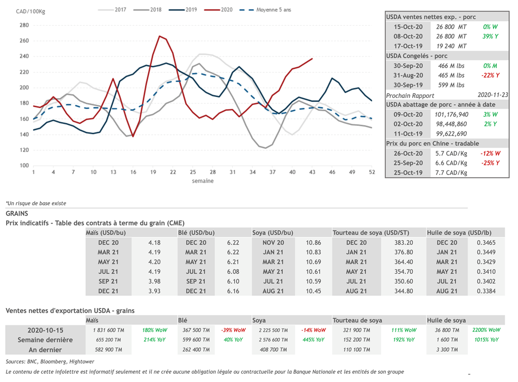 • Les contrats de porc ont transigé en baisse vendredi pour finalement reprendre de la vigueur et terminer la session en hausse, à l'exception du contrat de mai 2021. Le gain fait par le contrat de décembre 2020, 0,825 cent US/lb (+1,25%), n'aura cependant pas été suffisant pour rattraper la perte de 3 cents US/lb jeudi. Le contrat demeure au même niveau qu'il y a 3 semaines environ alors que les contrats de février à août 2021 sont redescendus près de leurs niveaux du début du mois de septembre après avoir atteint un sommet il y a environ une semaine et demie.