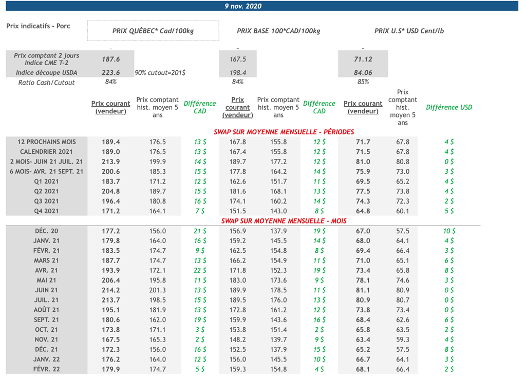 • La journée de vendredi s'est terminée avec un repli pour les contrats de porc de déc-2020, fév-21 et avr-21, mais la tendance haussière s'est maintenue pour les prix des échéances à plus long terme. Le contrat de déc-20 a perdu le plus en terminant la journée à 64,90 cents US/lb, en baisse de 2,5 cents US/lb (-3,7%). Les prix des contrats de mai à août 2021 n'ont toujours pas rattrapé le sommet atteint à la mi-octobre, bien que l'échéance d'août s'en rapproche de plus en plus.