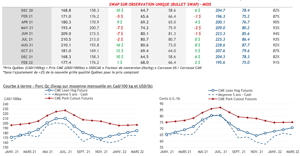 • L'indice de découpe de porc U.S. n'affiche toujours pas de tendance claire et s'est terminé à 78,12 cents US/lb hier (+0,22 cent US/lb), tandis que l'indice CME du cash du porc continue de baisser et a été rapporté à 65,79 cents US/lb (-0,47 cent US/lb).