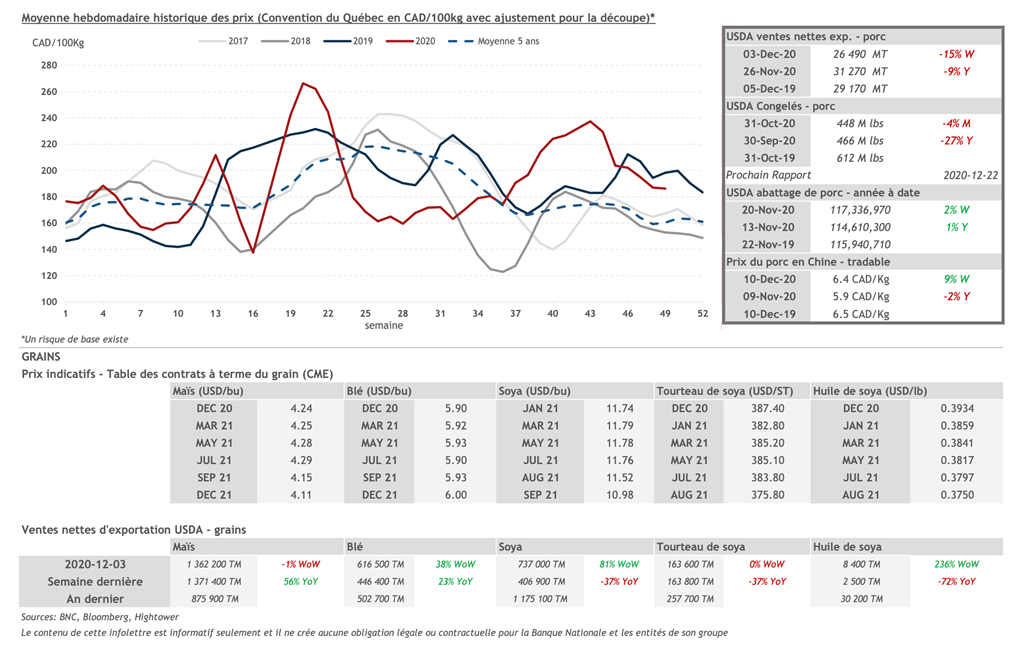 • 10 décembre : USDA — Ventes nettes d’exportations pour les grains et le porc