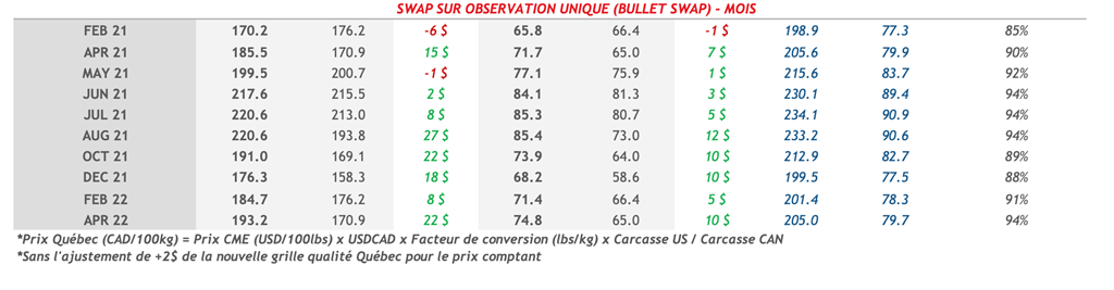 • Sur la journée d'hier, les contrats de porcs de février à mai 2021 était en baisse, surtout février de -1.65 cents US/lb. Les maturités étaient par contre à la hausse, frôlant +1 cent US/lb pour la plupart.