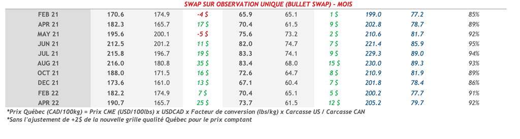 • Les contrats de porc ont subi une forte baisse hier et ont presque tous terminé dans le rouge. Les contrats de février, avril, juin, juillet et août 2021 ont perdu plus de 1 cent US/lb.