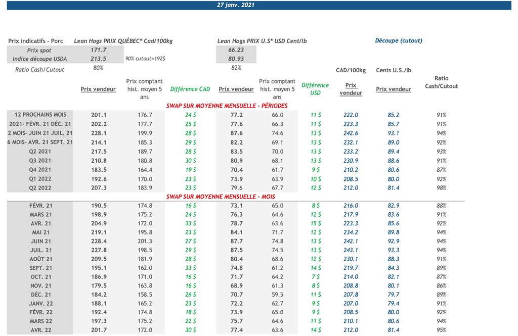 • Les contrats de porcs ont terminé la journée en légère hausse hier pour toutes les échéances sauf celle de février. Les gains sont demeurés sous la barre de 1 cent US/lb.