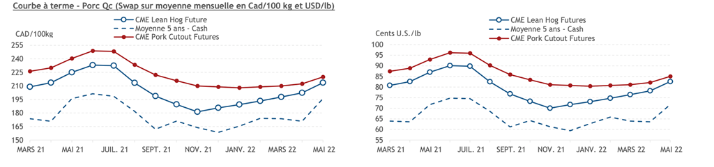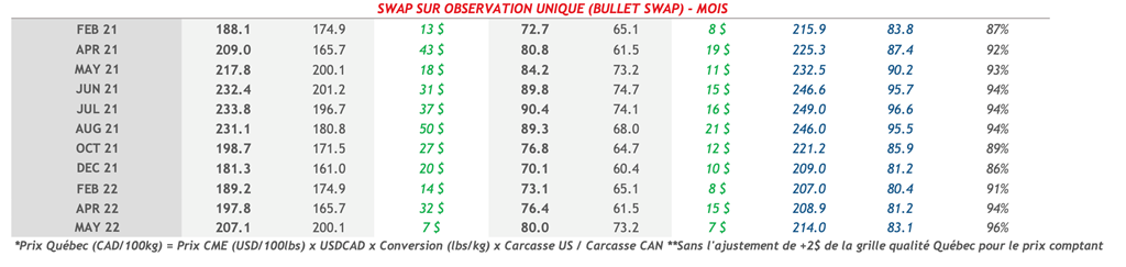 • Les contrats de porcs ont terminé en légère hausse hier pour les échéances de juillet 2021 à juin 2022. Les échéances à plus court terme étaient en repli à l’exception du contrat de février qui a fait un gain de 0,425 cent US/lb (+0,6%).