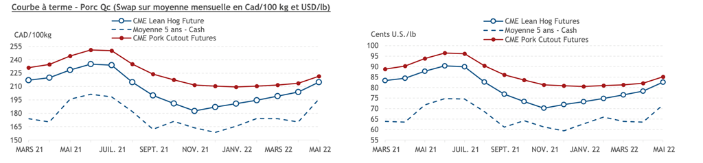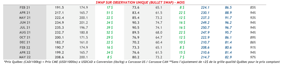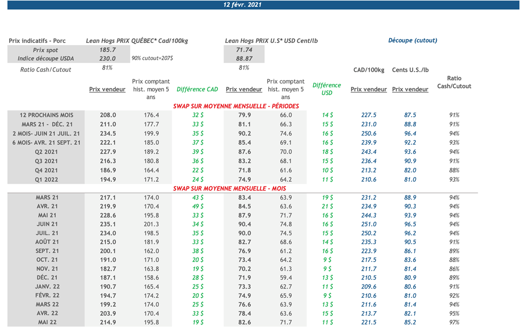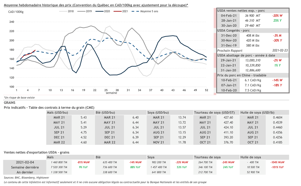 • Les contrats de porc ont terminé la journée en hausse hier pour toutes les échéances, surtout avril-21 (+2.425 cents USD/lb) et mai-21 (1.475 cents US/lb).
