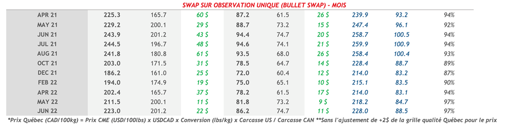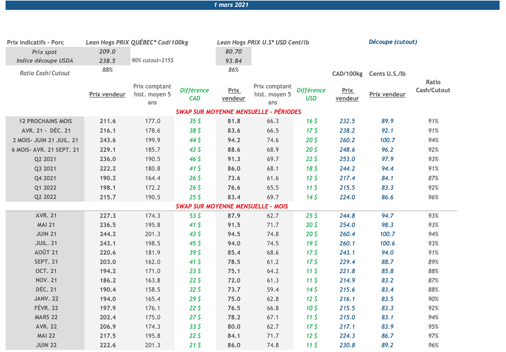 • Les contrats de porc ont terminé la semaine en fort repli vendredi. Les contrats des échéances d’avril 2021 à octobre 2021 étaient en baisse. Avril 2021 et mai 2021 ont perdu le plus, clôturant à 87,150 et 88,875 cents US/lb respectivement avec des pertes de 2,600 et 2,275 cents US/lb.