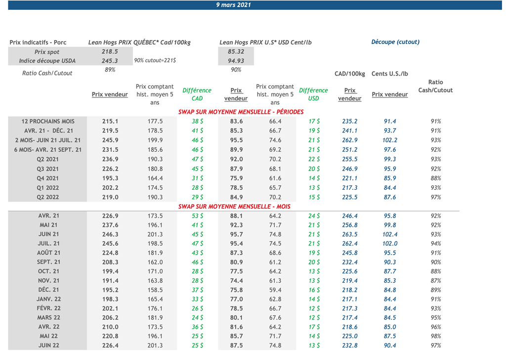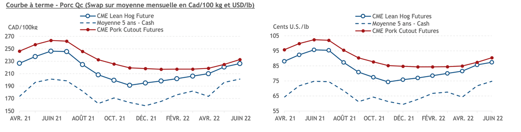 • La montée des prix du porc ne semblent pas s'essoufler. Le contrat de juillet 2021 est maintenant passé au-dessus de 96 cents US/lb. Les mois d'été à 100.0 cents US/lb représentent une cible pour plusieurs acteurs du marché. Si la montée se poursut, il ne suffit que de quelques jours avant de l'atteindre.