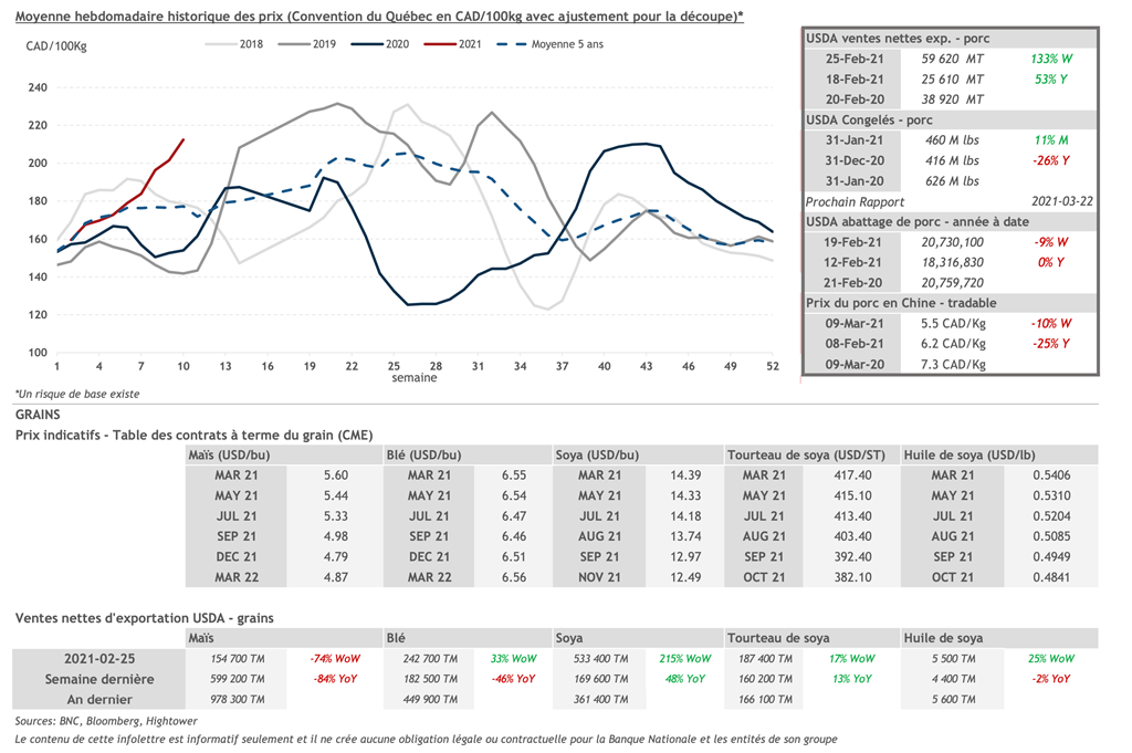 • 11 mars : USDA — Ventes nettes d’exportations pour les grains et le porc