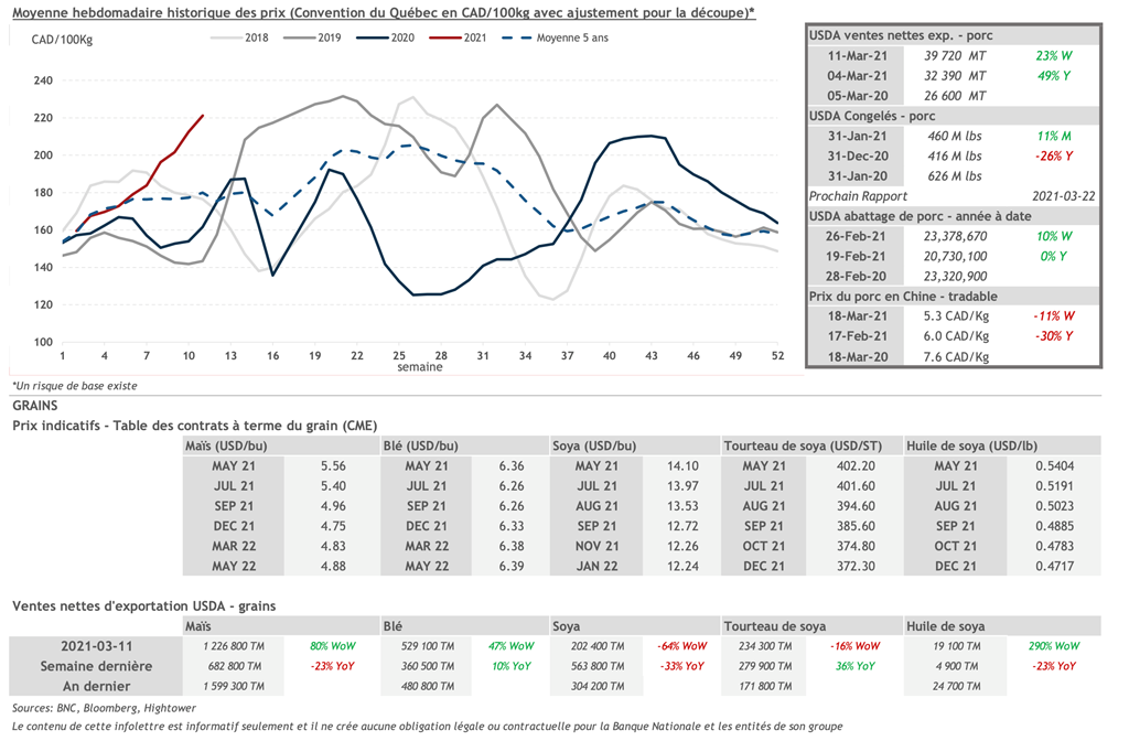 • La montée des prix du porc se poursuit. Les contrats d'été en US/lb sont plus élevés actuellement que les hauts de 2019 lorsque l'éclosion de la peste porcine africaine s'est réellement fait sentir. Le dollar canadien (0.8000) étant aussi fort ne permet pas au marché actuel d'atteindre les équivalents en CAD/100kg que l'on a vu en 2019 (0.7400) et les économistes n'anticipe pas une baisse de notre dollar d'ici la fin d'année.