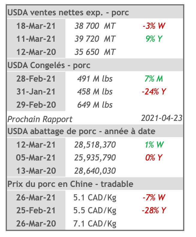 • Les contrats de porc étaient en hausse pour toutes les échéances hier. Les échéances d'avril à juillet 2021 ont toutes fait des gains supérieurs à 1 US cent/lb avec le gain notable du contrat de mai 2021 de 2,025 cents US/lb.