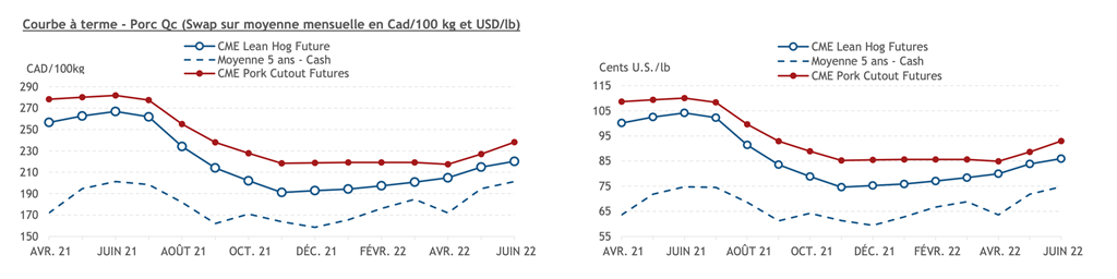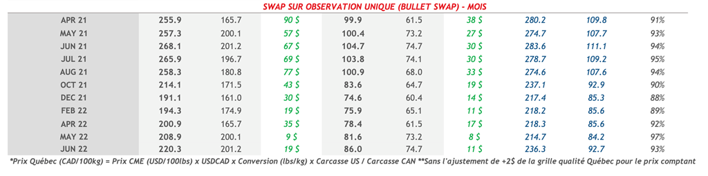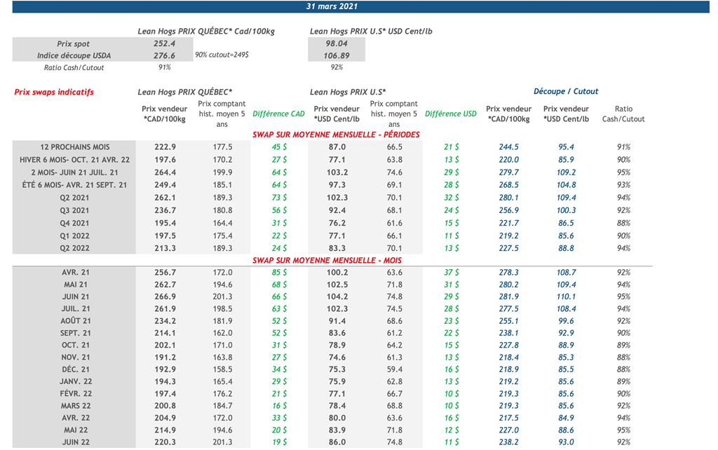 • Après une journée de léger repli lundi, les contrats de porc étaient de nouveau en hausse hier. Certaines échéances ont même rattrapé les pertes encourues la veille. Le contrat de mai 2021 s’est le plus apprécié en clôturant à 100,925 cents US/lb avec un gain de 1,175 cents US/lb.