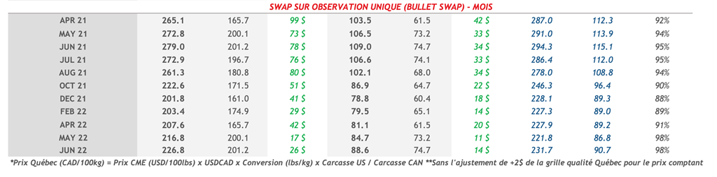 • Les contrats de porc ont terminé la journée avec des prix inchangés ou en légère hausse vendredi à l’exception des contrats d’août 2021, avril 2022 et juillet 2022 en baisse. Avec un prix de clôture de 108,95 cents US/lb, le contrat de juin 2021 se rapproche de plus en plus du seuil de 110 cents US/lb.