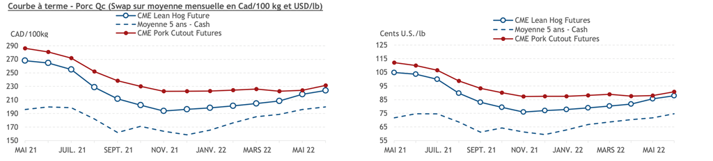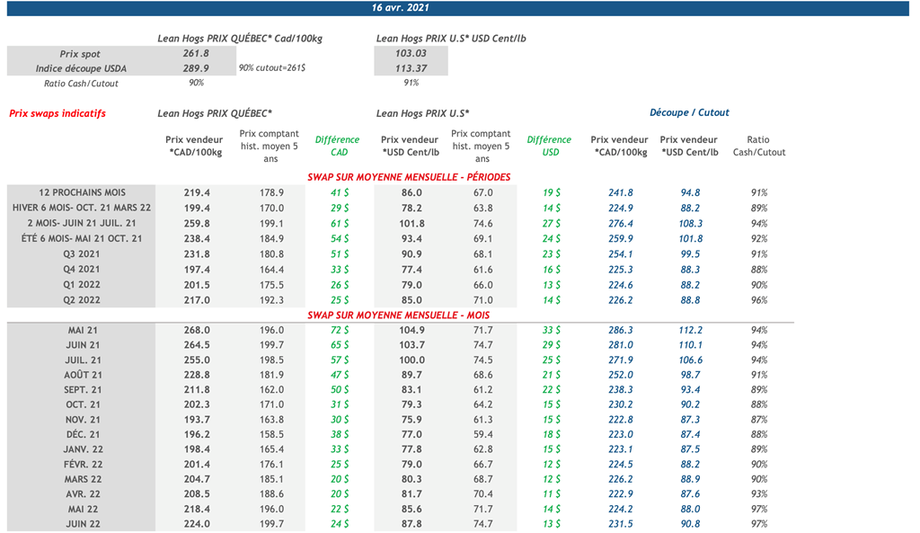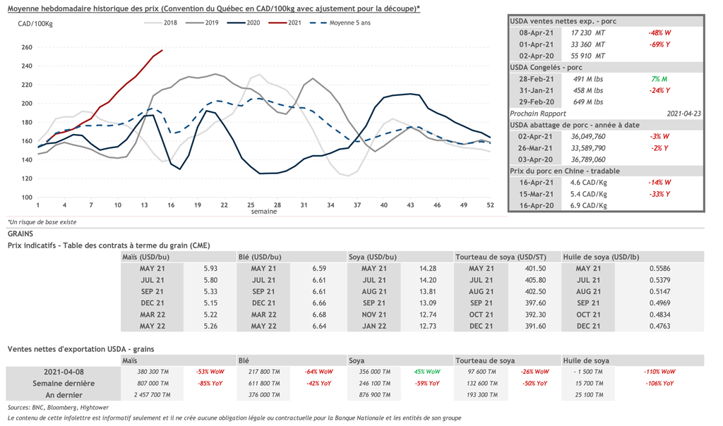 • Les contrats de porc se sont fortement repliés hier, faisant suite à la journée de gain mercredi. Les contrats de mai à août 2021 ont clôturé au « limit-down » avec une perte de 3 cents US/lb. Des prises de profit (renversement de positions d’achats) après un long rallye à la hausse pourraient avoir contribué à la chute des prix du porc. Les ventes nettes d’exportation U.S. étaient également en baisse de 48% par rapport à la semaine dernière, ce qui pourrait avoir fait pression sur les prix.