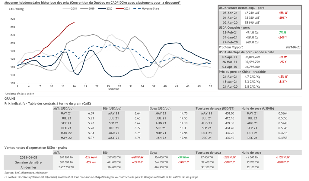 • Les contrats de porc ont continué de faire des gains hier pour une deuxième journée de suite. Les contrats de mai à juillet 2021 se sont appréciés de plus de 2 cents US/lb. La demande pour le porc demeure soutenue avec l’indice cash CME qui poursuit sa tendance haussière. L'indice atteint 104,42 US cents/lb ce matin.