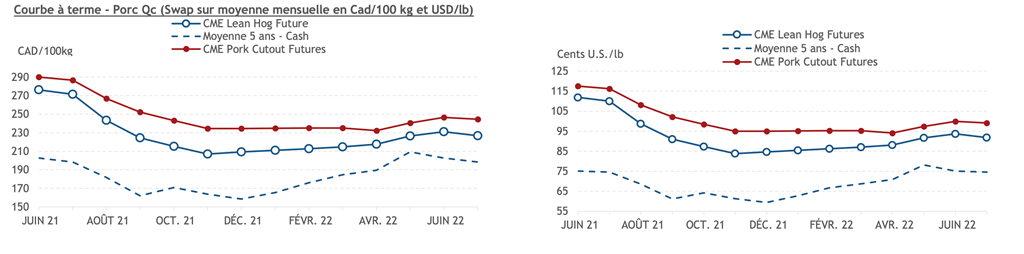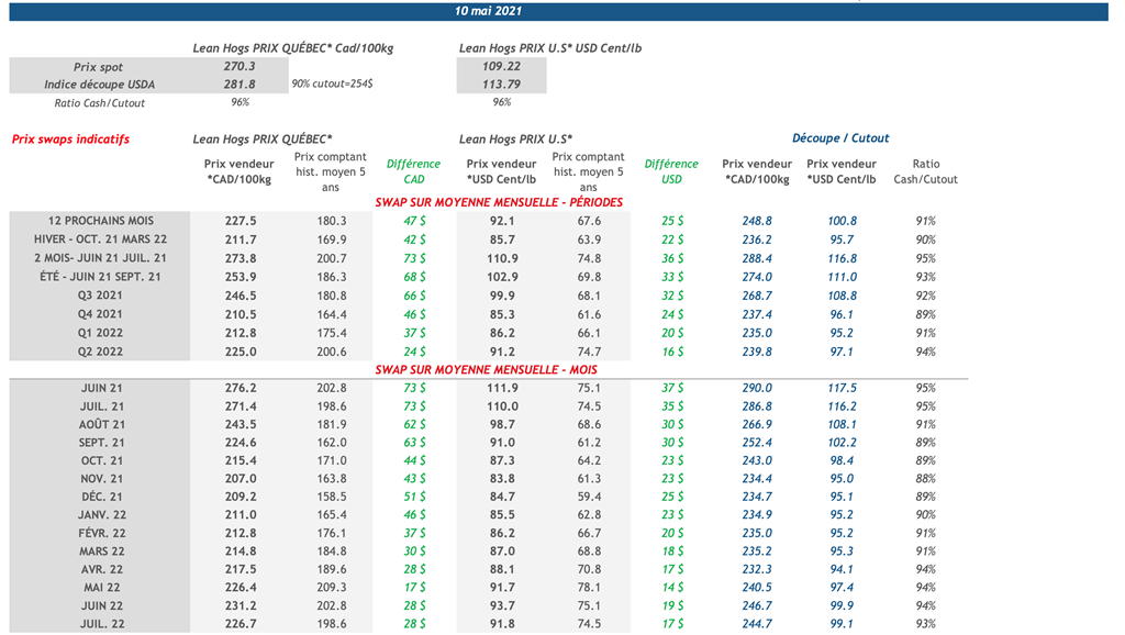• Les contrats de porc ont terminé la journée en hausse vendredi à l’exception des échéances de juin à août 2021. Les contrats de février à juillet 2022 ont tous gagné plus de 1 cent US/lb. Le contrat de juillet 2021 a perdu le plus et a chuté de 1,625 cent US/lb.