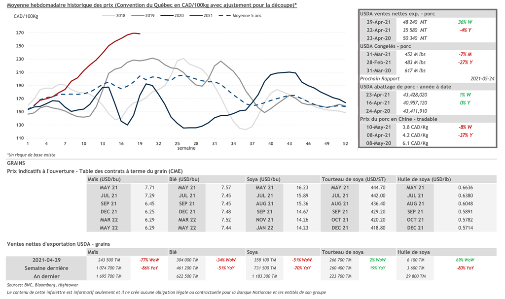 • 13 mai : USDA — Ventes nettes d’exportations pour les grains et le porc