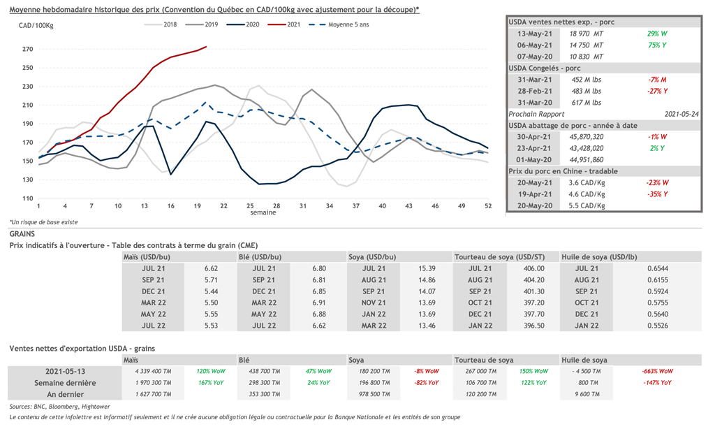 • 20 mai : USDA — Ventes nettes d’exportations pour les grains et le porc