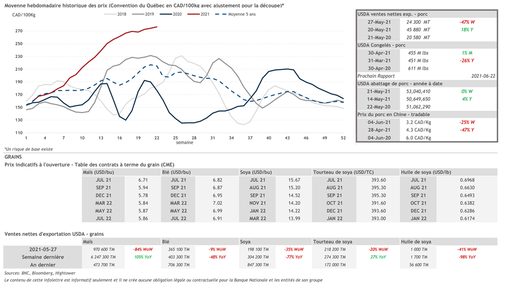 • Les contrats de porc étaient en hausse pour toutes les échéances hier. Les contrats de juin, octobre et décembre 2021 ainsi que le contrat d’août 2022 ont tous fait des gains supérieurs à 1 cent US/lb.