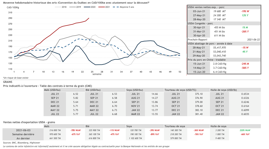 • 17 juin : USDA — Ventes nettes d’exportations pour les grains et le porc