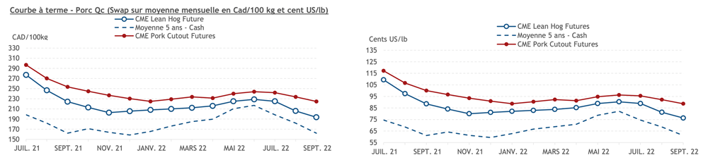 • L’indice de la découpe de porc U.S. était en hausse hier après-midi. L’indice s’est établi à 124,83 cents US/lb. Pendant que les prix de la plupart des coupes chutaient, le flanc (belly) rebondissait et faisait un gain de 34,71 cents US/lb, ce qui a soutenu le prix de la découpe. L'indice du cash lean hogs est en repli à 121,68 cents US/lb (-0.92).