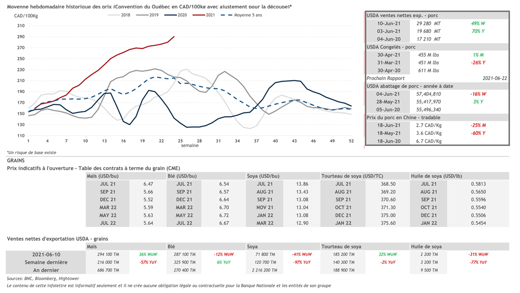 • Après la dégringolade des prix mercredi, les contrats de porc de juillet et août 2021 ont clôturé au prix « limit-down » pour une deuxième journée de suite. Ces deux contrats ont terminé la journée à 111,00 et 107,20 cents US/lb respectivement avec des pertes de 4,50 cents US/lb. Le reste des échéances était également en baisse.
