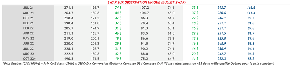 • Les contrats de porc ont repris un peu de force vendredi avec les échéances d’octobre 2021 à août 2022 terminant la journée en hausse. Cependant, ces gains sont loin d’être suffisants pour rattraper le terrain perdu. À titre d’exemple, le contrat de juillet 2021 a perdu 2,325 cents US/lb vendredi, ce qui amène la perte à 11,30 cents US/lb depuis le vendredi 11 juin. Les contrats d’août et d’octobre 2021 n’ont pas fait meilleure figure au cours de la même période avec des pertes de 10,30 et 8,50 cents US/lb respectivement.