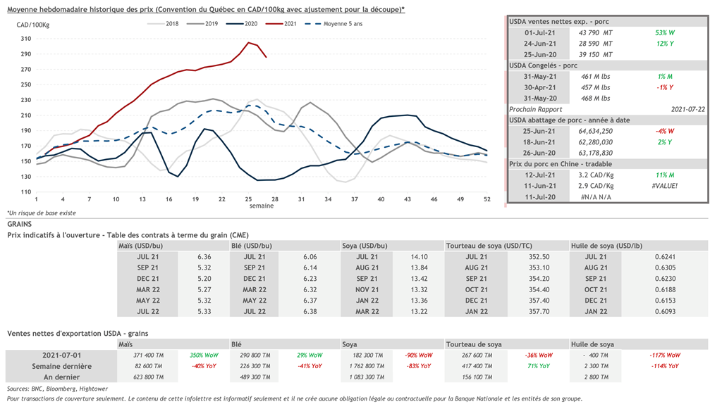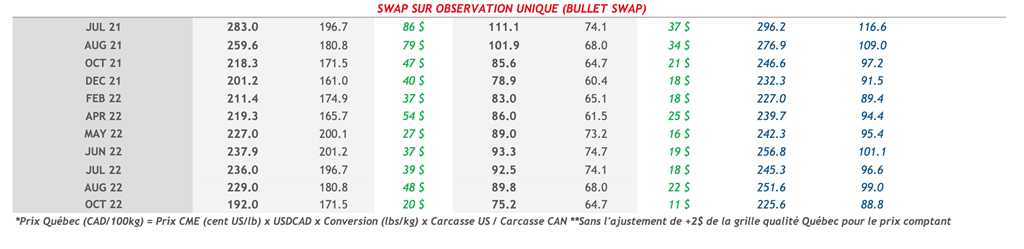 • Vendredi, les contrats de porcs ont continué leur tendance haussière de la semaine dernière. Tous les échéances ont terminé la journée dans le vert avec les contrats de juillet et août 2021 terminant en hausse de 0.900 et 1.200 cent US/lb respectivement et concluant la journée à 111.00 et 101.575 cent US/lb. Le contrat d'octobre 2021 a fait le plus fort gain avec 1,325 cent US/lb.
