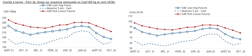 • L'indice de la découpe de porc U.S. était à la hausse aussi. L'indice a toutefois terminé la semaine avec une légère perte de 0.45 cent US/lb vendredi, pour conclure la semaine à 116.44 cents US/lb. À l'inverse, le prix cash CME était à la baisse et a conclu la semaine à 109.77 cents US/lb, pour une perte de 0.36 cent US/lb.
