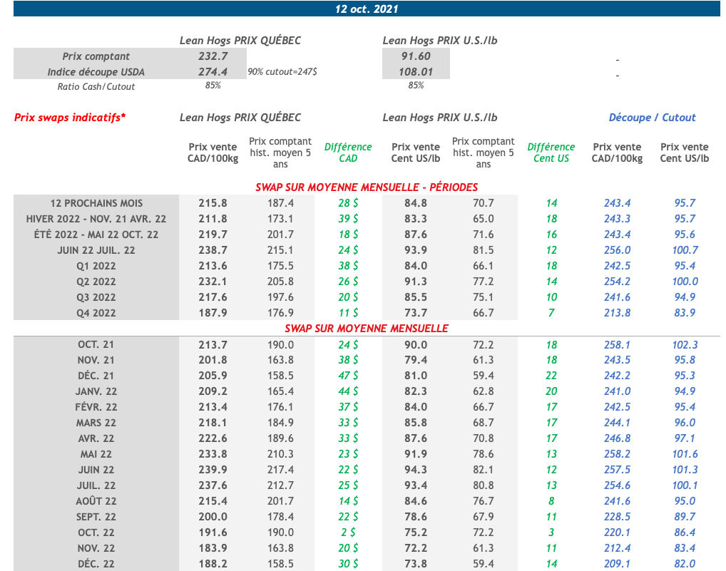 • Les contrats de porc étaient en baisse hier jusqu'au mois d'octobre 2022. Comme attendu, l'indice de découpe de porc U.S. est remonté à 108,01 cents US/lb, un gain de 1,02 cents US/lb. Ce matin, l'indice CME Cash de porc baisse toujours à 91,60 cents US/lb (-0,35).