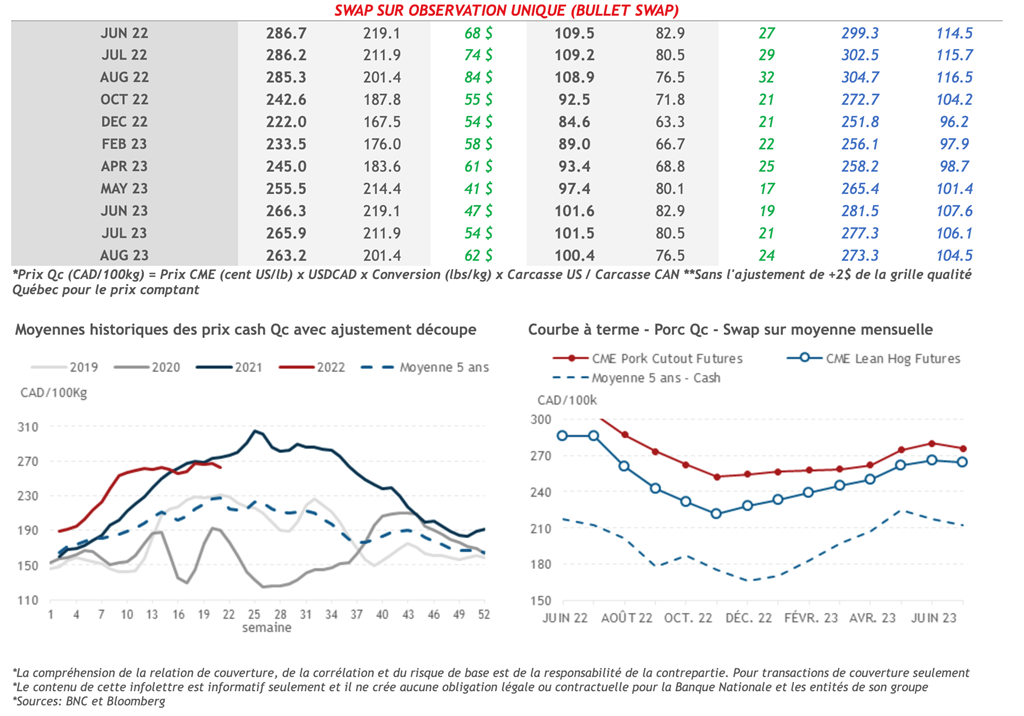 • L’indice de la découpe de porc américaine était toujours en hausse hier à 108,24 cents US/lb, malgré l’augmentation des inventaires. La coupe la plus en hausse était le flanc de porc.
