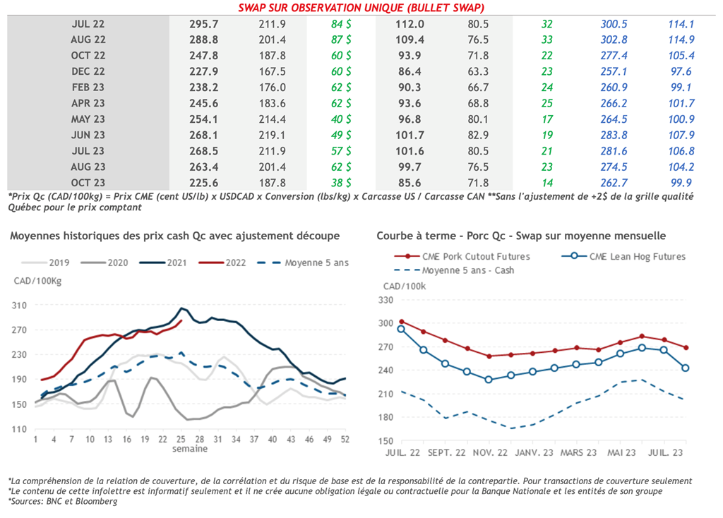 • Hier, les prix des contrats de porc de juillet ont clôturés à 112,725 cents US/lb, le plus haut niveau depuis le 28 avril. Une amélioration des fondamentaux du marché au comptant et un temps chaud dans le Midwest ont contribué à soutenir les prix. Nous avons observé une tendance similaire sur les contrats d'août qui ont terminé en hausse de 1,925 cents US/lb.