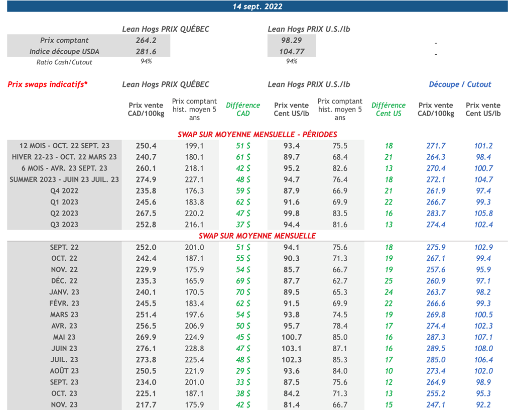 • Hier, les prix à terme du porc ont clôturé en forte hausse sur la séance. Les facteurs haussiers comprenaient des attentes d'une nouvelle augmentation des valeurs de la découpe et la spéculation selon laquelle la récente détérioration du marché au comptant entraînerait une amélioration des marges des conditionneurs. Le prix du contrat d'octobre-22 a augmenté de 3,88 cents US/lb pour atteindre 95,75 cents US/lb, son plus haut niveau depuis le 17 août. Le prix du contrat de décembre-22 a augmenté de 2,93 cents US/lb pour atteindre 85,70 cents US/lb.