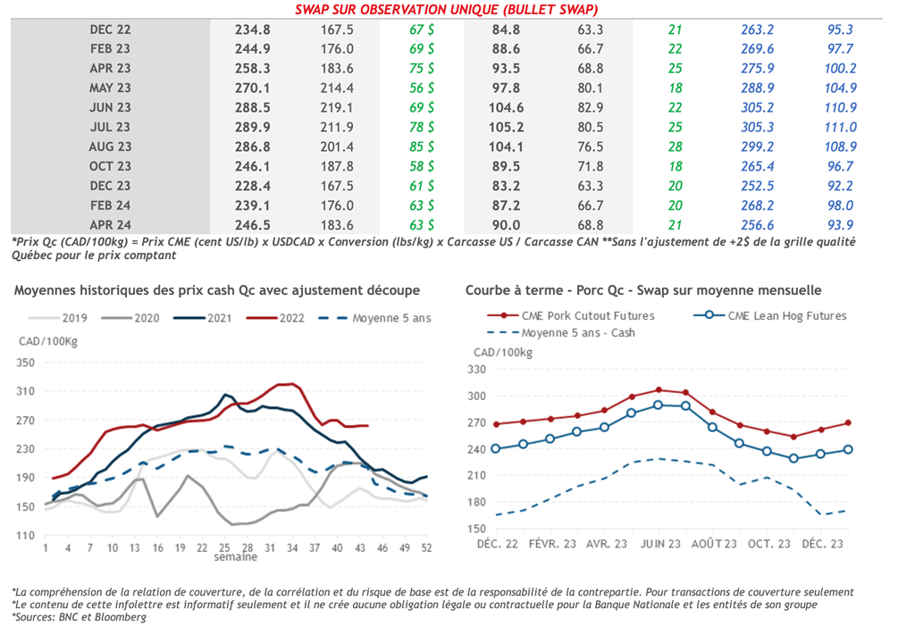 • La journée d'hier a été mitigée pour les contrats à terme sur le porc. Les deux contrats les plus activement négociés, décembre-22 et février-22, ont légèrement baissé en raison de l'affaiblissement des fondamentaux au comptant, cédant 1,17 et 0,40 cents US/lb pour clôturer à 84,93 et 88,45 cents US/lb, respectivement. Tous les autres contrats étaient en légère hausse, mais sur des volumes plus faibles.