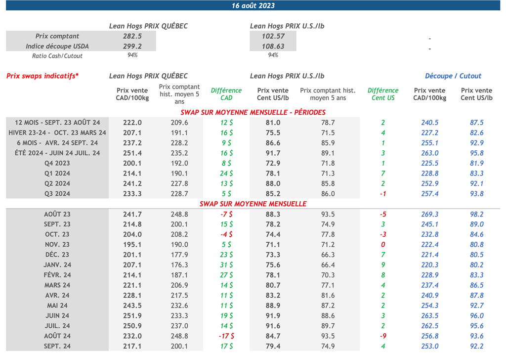 • Hier, les contrats à terme sur le porc ont baissé pour toutes les échéances. Notamment, le de décembre-23 a enregistré une baisse de 1,40 cent US/lb, clôturant à 71,25 cents US/lb.