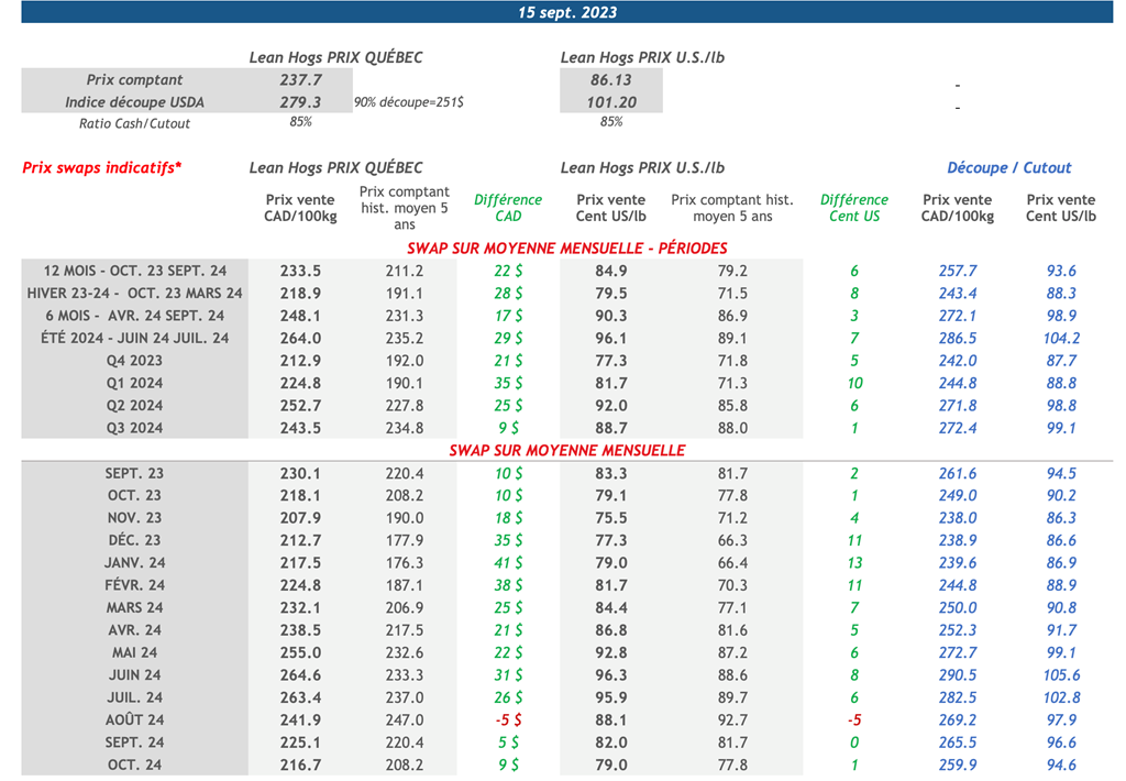 • Les contrats à terme sur le porc pour toutes échéances étaient en baisse hier, avec celui pour Déc-23 et Fév-24 qui ont enregistré la plus forte baisse de -1.250 cents US/lb et -1.150 cents US/lb respectivement.